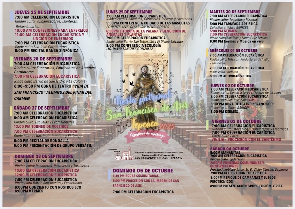 De Igual forma, la festividad principal será el próximo 4 de octubre con Celebración eucarística de Fiesta y confirmaciones a las 14 horas presidida por el Arzobispo de Puebla Víctor Sánchez Espinosa en el Ex convento franciscano