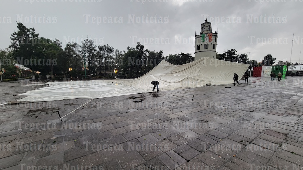 Colapsó la carpa para la feria de octubre instalada en el centro histórico; Protección Civil realiza recorridos para apoyar en labores