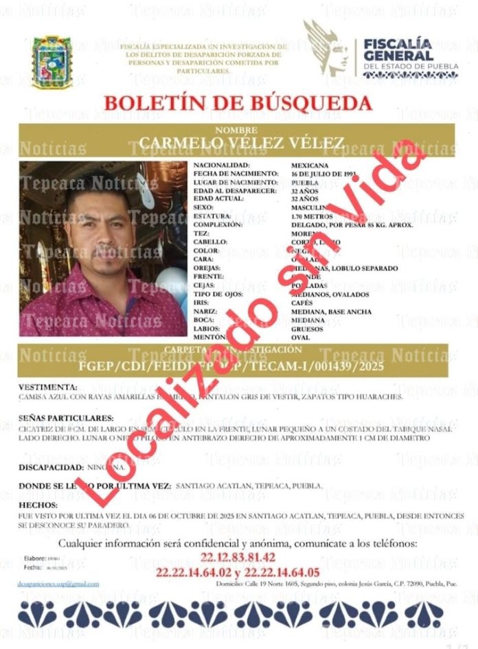 Cabe resaltar que el pasado 6 de octubre la Fiscalía Especializada en desaparición de personas informó que una persona del sexo masculino de nombre Carmelo Vélez Vélez fue reportada como desaparecida en la junta auxiliar de Santiago Acatlán el pasado 6 de octubre del presente 2025 , en esta cabecera municipal de Tepeaca sin que hasta el momento se sepa del paradero o lugar en que se encuentre .