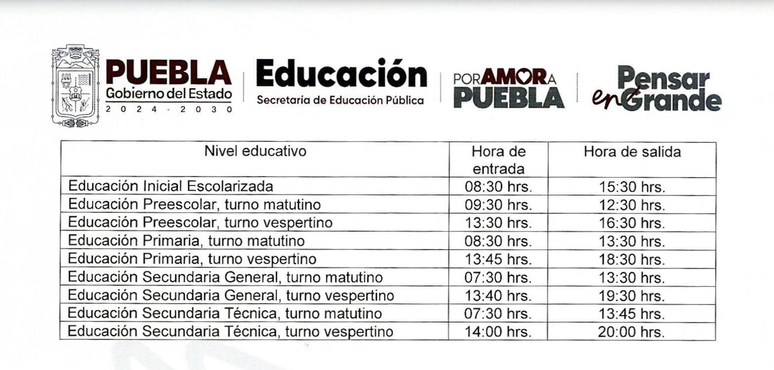 Educación inicial escolarizada de 08:30 a 15:30 horas; preescolar turno matutino de 09:30 a 12:30 horas y vespertino de 13:30 a 16:30 horas; primaria turno matutino, de 08:30 a 13:30 horas y vespertino de 13:45 a 18:30 horas; secundaria turno matutino, de 07:30 a 13:30 horas y vespertino de 13:40 a 19:30 horas; secundaria técnica turno matutino, de 07:30 a 13:45 horas y vespertino de 14:00 a 20:00