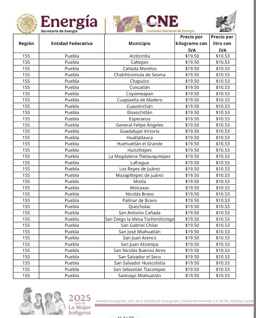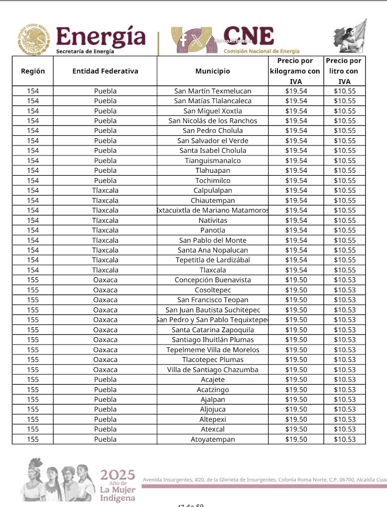 Tepeaca de Negrete.- El precio del gas LP al consumidor sufrió ligera variación en el municipio de Tepeaca y la región, y desde este domingo 9 de noviembre , tiene un valor por kilogramo de 19.50 y 10.53 por litro , reveló la Comisión Nacional de Energía de la Secretaría de Energía del Gobierno Federal y que estarán vigentes hasta el sábado 15 de noviembre del 2025.