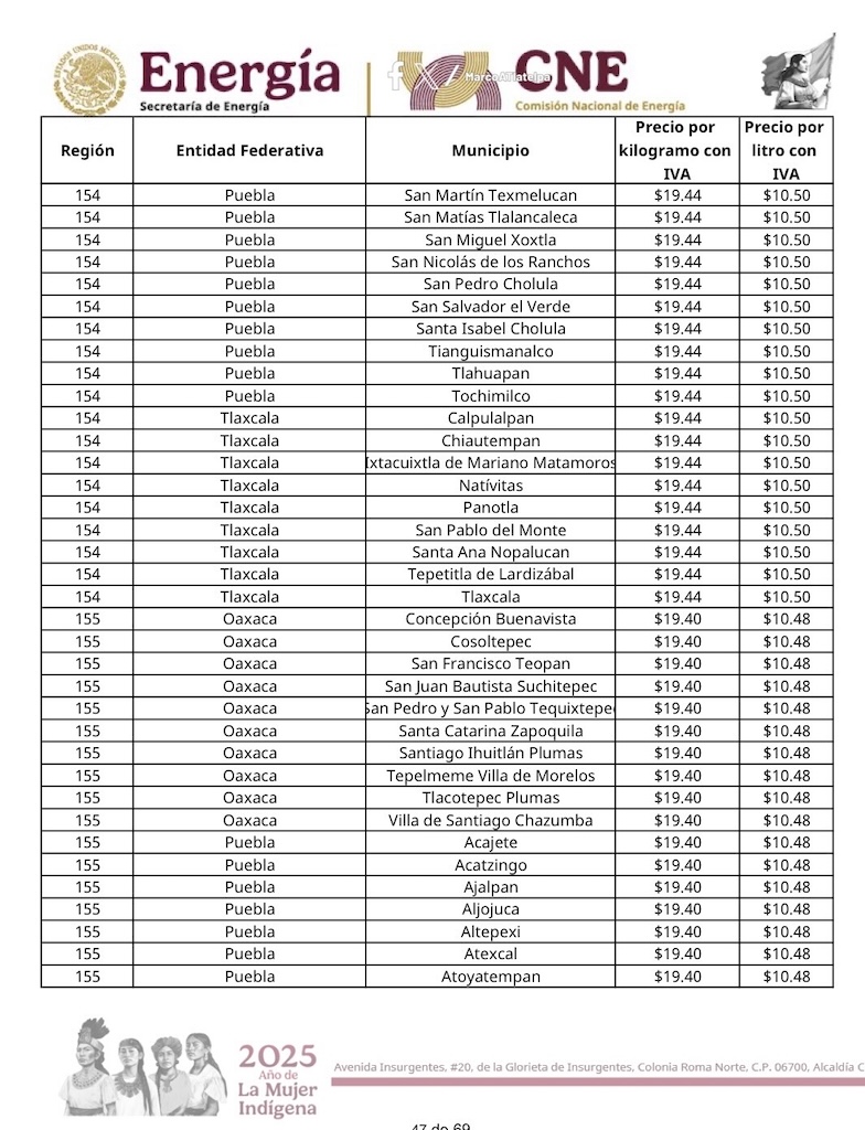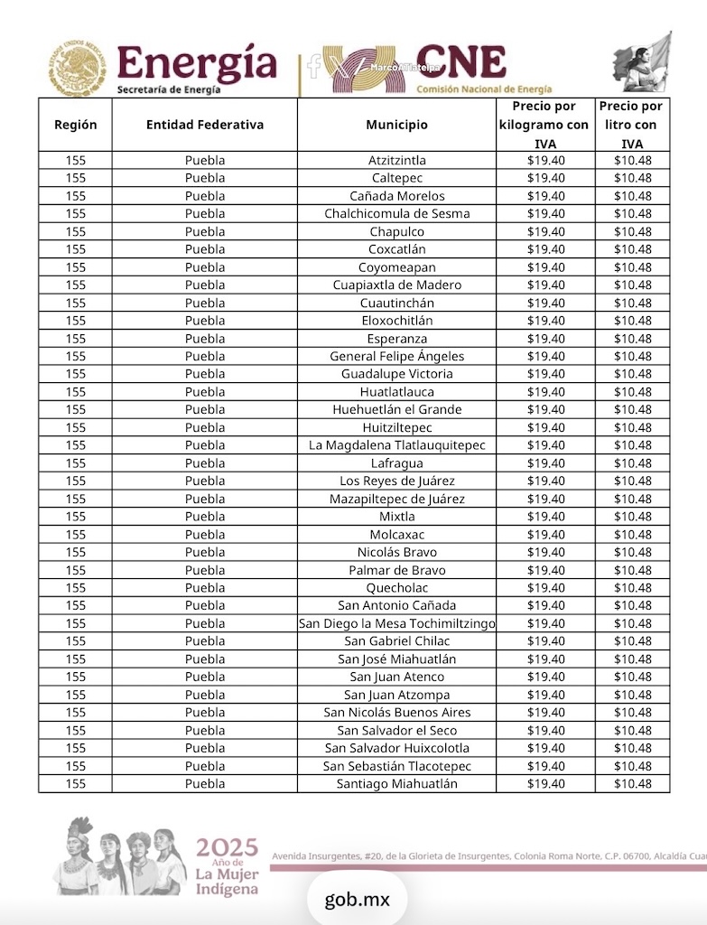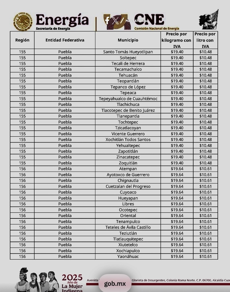 Tepeaca de Negrete.- El precio del gas LP al consumidor sufrió ligera variación en el municipio de Tepeaca y la región, y desde este domingo 16 de noviembre , tiene un valor por kilogramo de 19.40 y 10.48 por litro , reveló la Comisión Nacional de Energía de la Secretaría de Energía del Gobierno Federal y que estarán vigentes hasta el sábado 22 de noviembre del 2025.