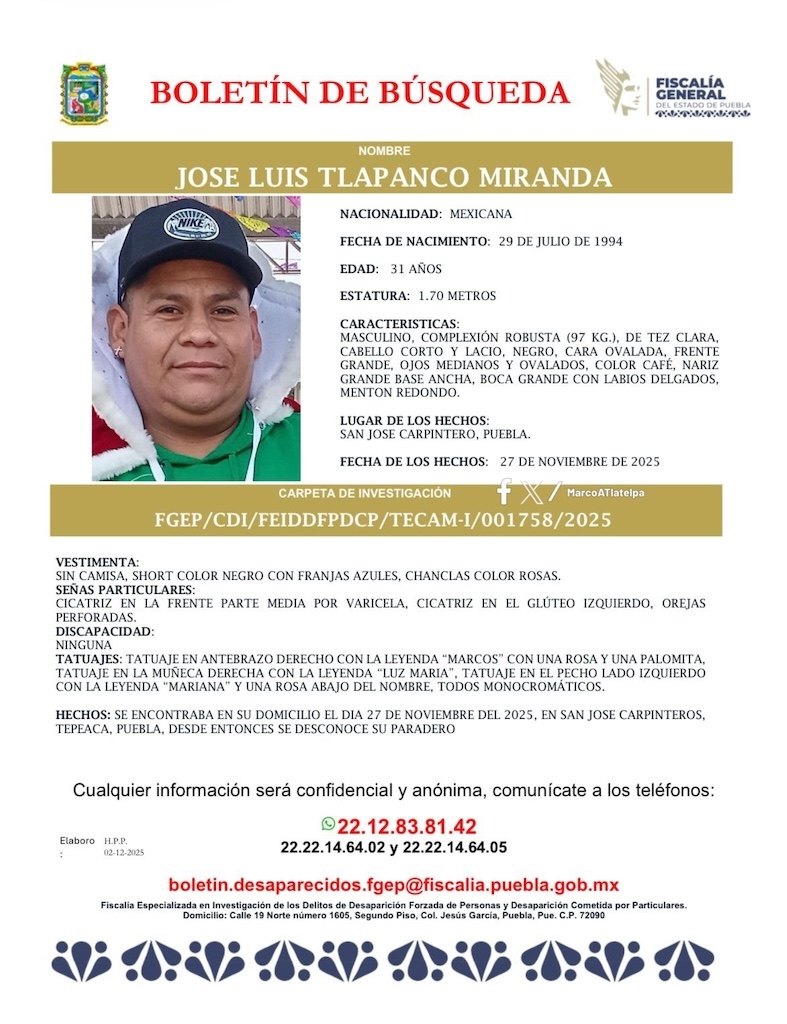 Tepeaca de Negrete.- Dos hermanos de nombres José Luis y Cesar Tlapanco Miranda , de 31 y 24 años de edad, desaparecieron en la junta auxiliar de San José Carpinteros, perteneciente a Tepeaca , desde el pasado 27 de noviembre sin que hasta la fecha se conozca de su paradero o lugar en el que se encuentren.