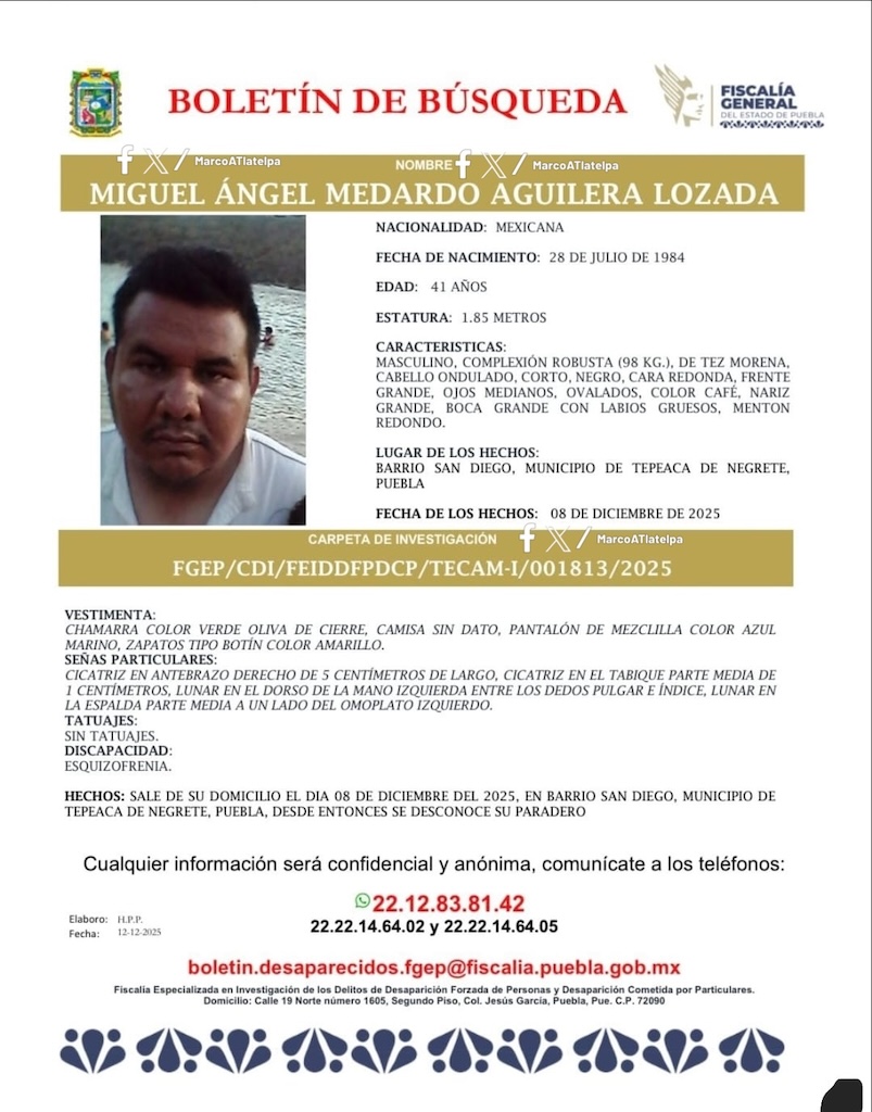 Tepeaca de Negrete.- Un masculino de nombre Miguel Ángel Medardo Aguilera Lozada , de 41 años de edad desapareció en el barrio San Diego en esta cabecera municipal de Tepeaca el pasado 8 de diciembre sin que hasta la fecha se conozca el paradero o lugar en el que se encuentre.