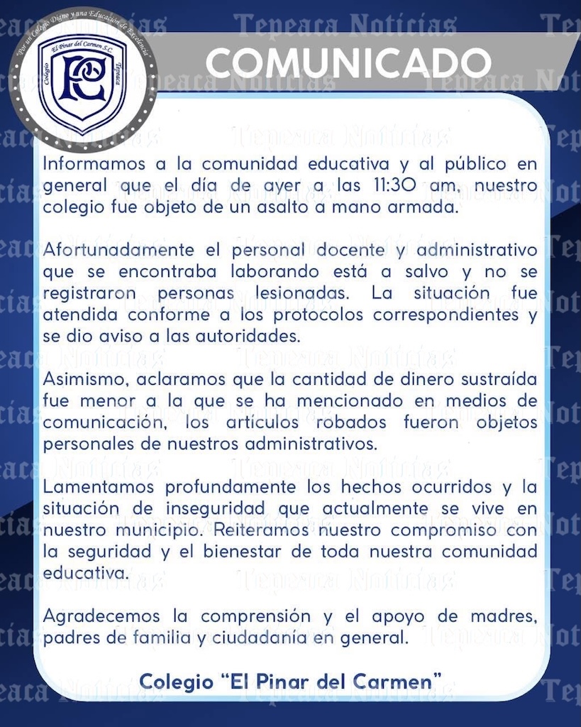 ” El día de ayer a las 11:30 am, nuestro colegio fue objeto de un asalto a mano armada…Afortunadamente el personal docente y administrativo que se encontraba laborando está a salvo y no se registraron personas lesionadas. La situación fue atendida conforme a los protocolos correspondientes y se dio aviso a las autoridades”, informó