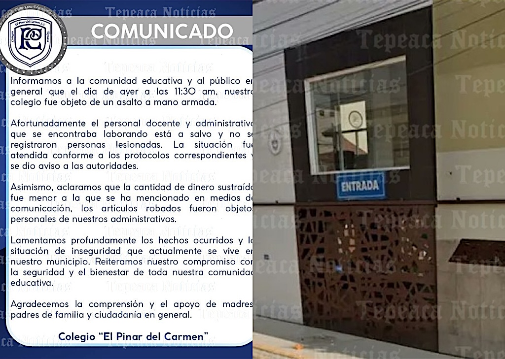 Tepeaca de Negrete.- A través de comunicado , autoridades educativas del Colegio Pinar del Carmen confirmó que el pasado miércoles fueron asaltadas su instalaciónes sin que personal de esa institución educativa resultara lesionada