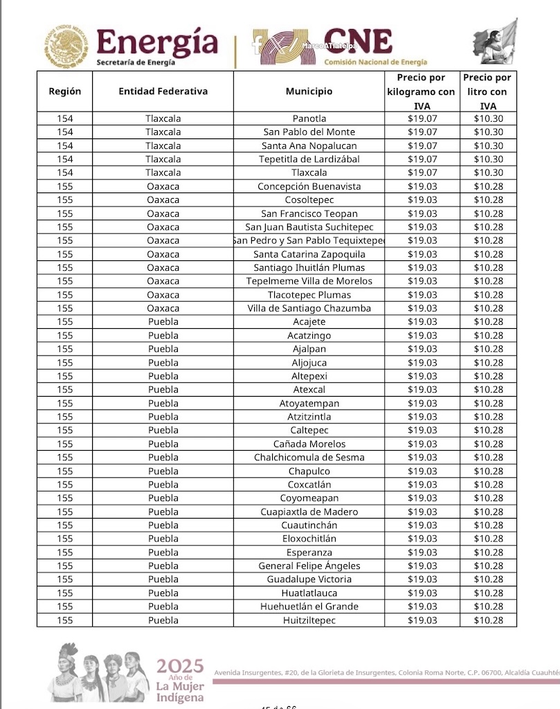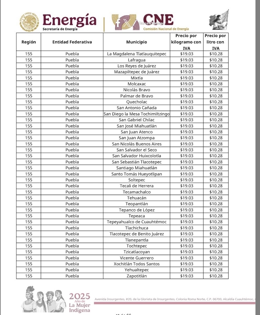 Tepeaca de Negrete.- El precio del gas LP al consumidor tendrá variación a la baja en el municipio de Tepeaca y la región, y desde este domingo 21 de diciembre , mantiene un valor por kilogramo de 19.03 y 10.28 por litro , reveló la Comisión Nacional de Energía de la Secretaría de Energía del Gobierno Federal y que estarán vigentes hasta el sábado 27 de diciembre del 2025.
