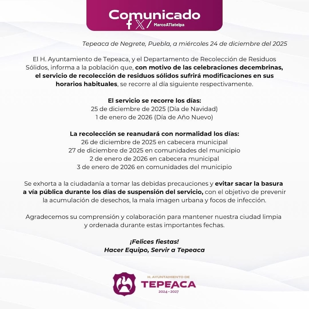 Tepeaca de Negrete.-El ayuntamiento de Tepeaca , a través del la dirección de servicios municipales , informó que con motivo de las celebraciones navideñas , mañana jueves 25 de diciembre del presente 2025 y el próximo primero de enero del 2026 no habrá recolección de basura en la cabecera y comunidades.
