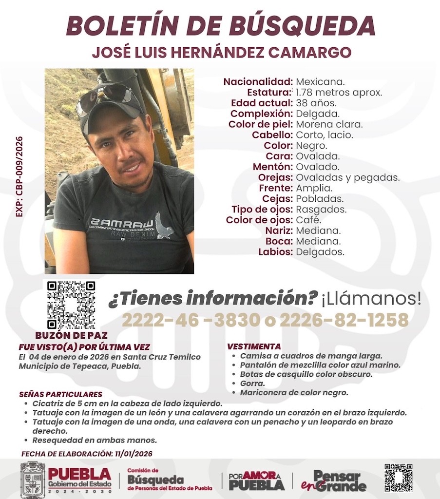 Tepeaca de Negrete.-Un masculino de nombre José Luis Hernández Camargo, de 38 años, 1.76 metros de estatura, complexión delgada y piel morena desapareció el pasado 4 de enero del presente 2026 , en el barrio de Santa Cruz Temilco en Tepeaca, sin que hasta la fecha se conozca el lugar en el que se encuentra o su paradero .