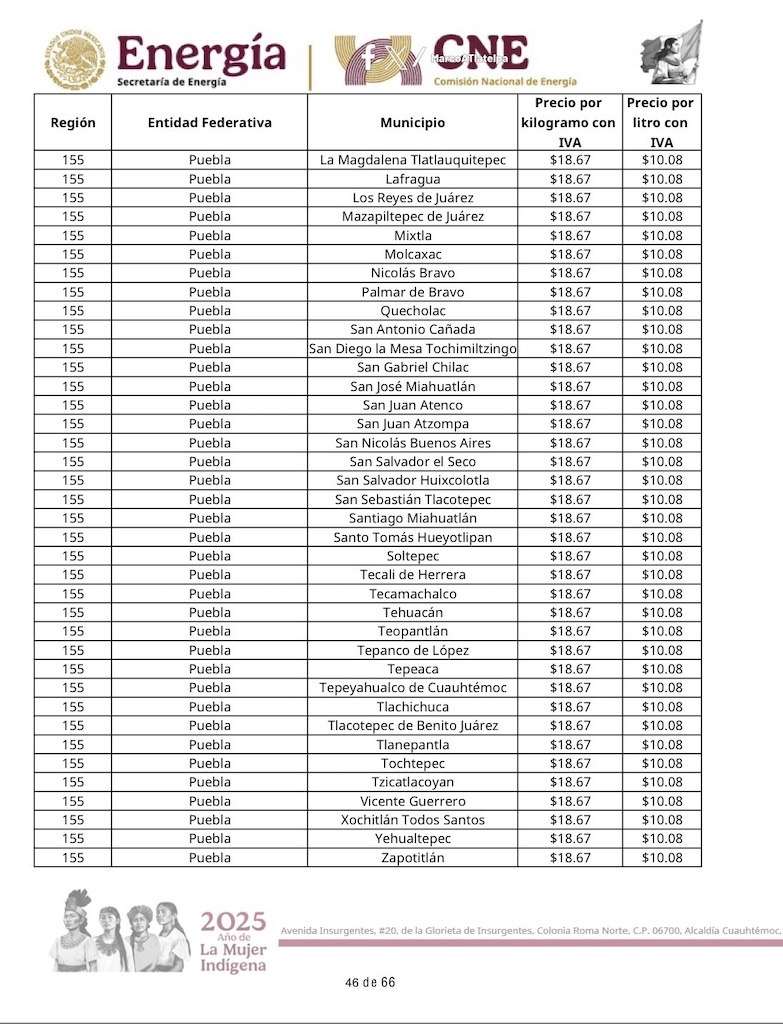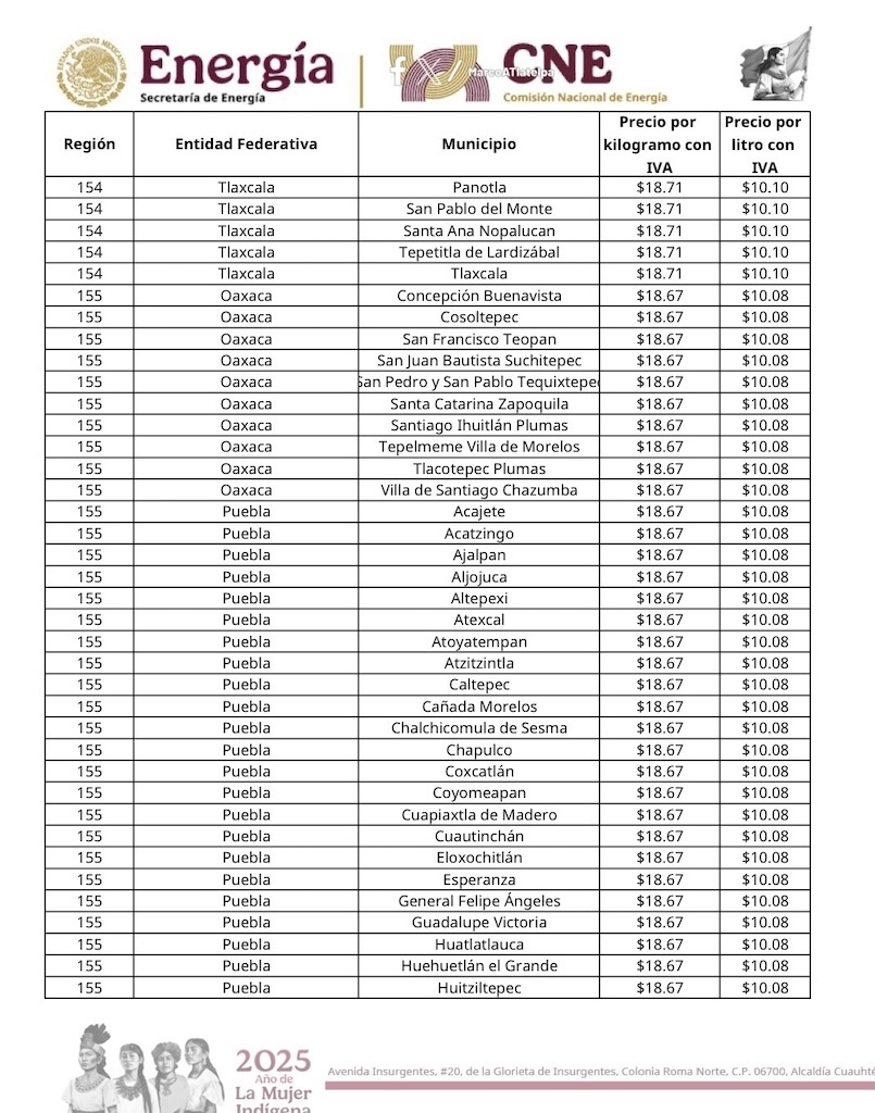 Tepeaca de Negrete.- El precio del gas LP al consumidor no tendrá variación en el municipio de Tepeaca y la región, y desde este domingo 18 de enero , mantiene un valor por kilogramo de 18.67 y 10.08 por litro , informó la Comisión Nacional de Energía de la Secretaría de Energía del Gobierno Federal y que estarán vigentes hasta el sábado 24 de enero del 2026.