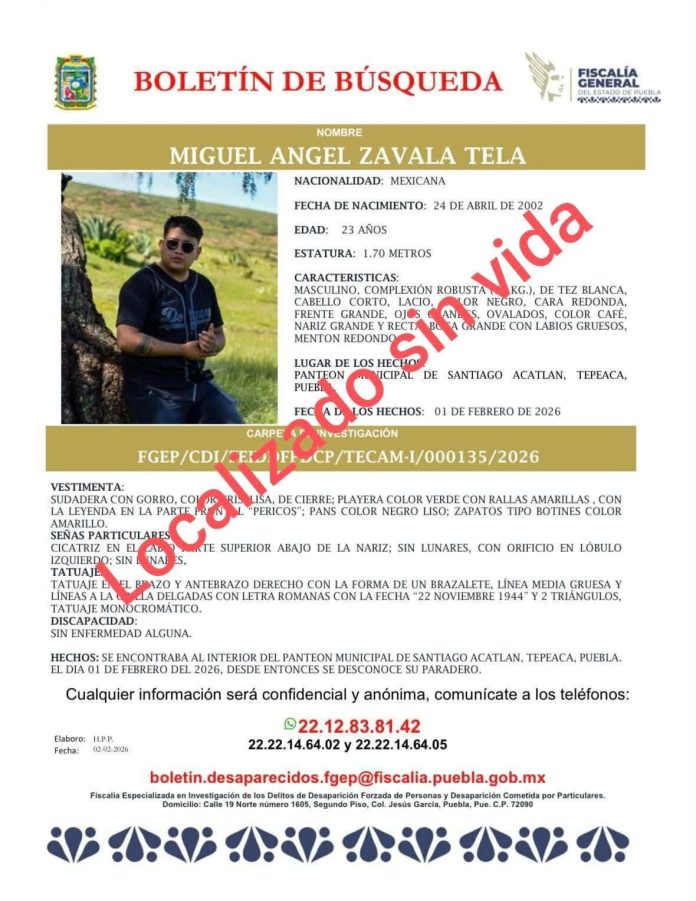 Tepeacade Negrete.- El joven de nombre Miguel Ángel Zavala Tela de 23 años de edad,1.73 metros de estatura , complexión robusta , piel blanca y cabello corto lacio quién desapareció el pasado 1 de febrero en la junta auxiliar de Santiago Acatlan, en Tepeaca fue hallado sin vida de acuerdo a la actualización de datos de su ficha de desaparición