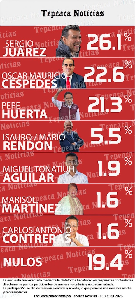 El más reciente sondeo de opinión de Tepeaca Noticias, realizado de forma abierta y voluntaria en Facebook en los inicios de este mes de febrero 2026, arroja un panorama interesante y revelador en el arranque temprano de las preferencias rumbo a 2027 en Tepeaca. Con una muestra amplia a seguir , los números hablan claro , el actual coordinador de Delegados Estatales del Bienestar Sergio Juárez Martínez se vislumbra y posiciona como uno de los perfiles más interesantes , como el claro puntero con 26.1% de las preferencias para ser candidato a alcalde por el partido en el poder , abriendo una ventaja visible sobre otros perfiles que aspiran a ese cargo.