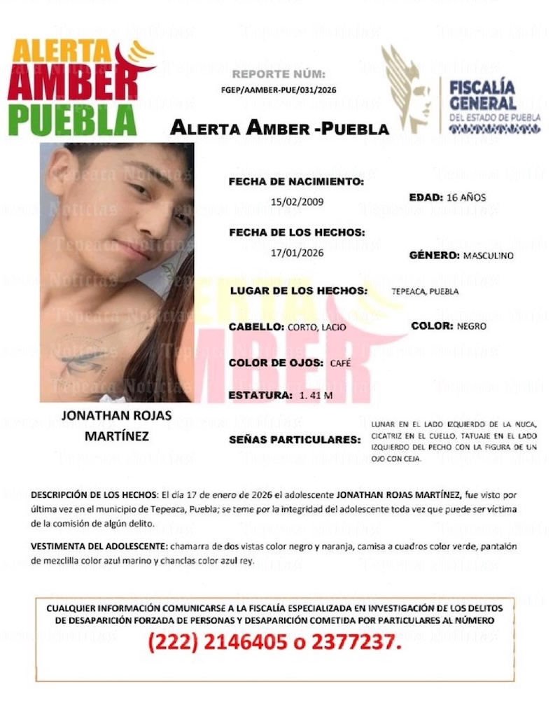 Tepeaca de Negrete.- Continúa la búsqueda del adolescente Jonathan Rojas Martínez, de 16 años de edad cabello corto lacio , ojos café y una estatura de 1.40 metros , quien desapareció en este municipio de Tepeaca el pasado 17 de enero del presente 2026 sin que hasta la fecha se conozca el paradero o lugar en el que se encuentra el menor de edad.