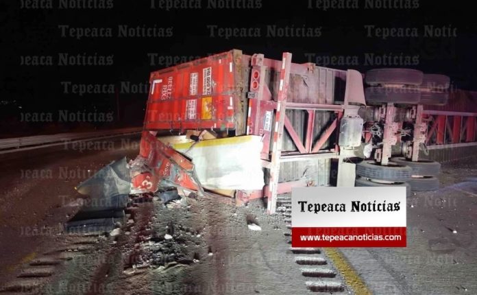 Acatzingo, Puebla.- Percance vial, registrado por la volcadura de un camión de carga sobre la autopista Puebla–Orizaba, a la altura del kilómetro 171, en el municipio de Acatzingo, dejó como saldo una persona sin vida y trafico muy complicado esa vialidad desde las primeras horas de este martes 10 de febrero