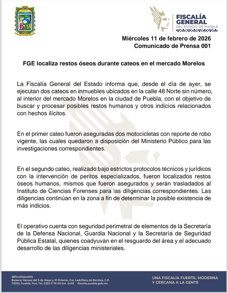 La Fiscalía General del Estado informa que, desde el día de ayer, se ejecutan dos cateos en inmuebles ubicados en la calle 48 Norte sin número, al interior del mercado Morelos en la ciudad de Puebla, con el objetivo de buscar y procesar posibles restos humanos y otros indicios relacionados con hechos ilícitos.