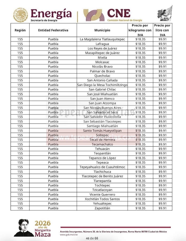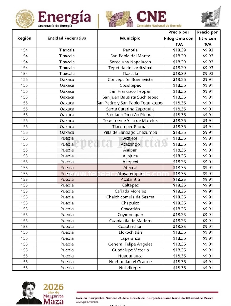 Tepeaca de Negrete.- El precio del gas LP al consumidor tendrá variación en el municipio de Tepeaca y la región, y desde este domingo 15 de febrero , mantiene un valor por kilogramo de 18.35 y 9.91 por litro , informó la Comisión Nacional de Energía de la Secretaría de Energía del Gobierno Federal y que estarán vigentes hasta el sábado 21 de febrero del 2026.