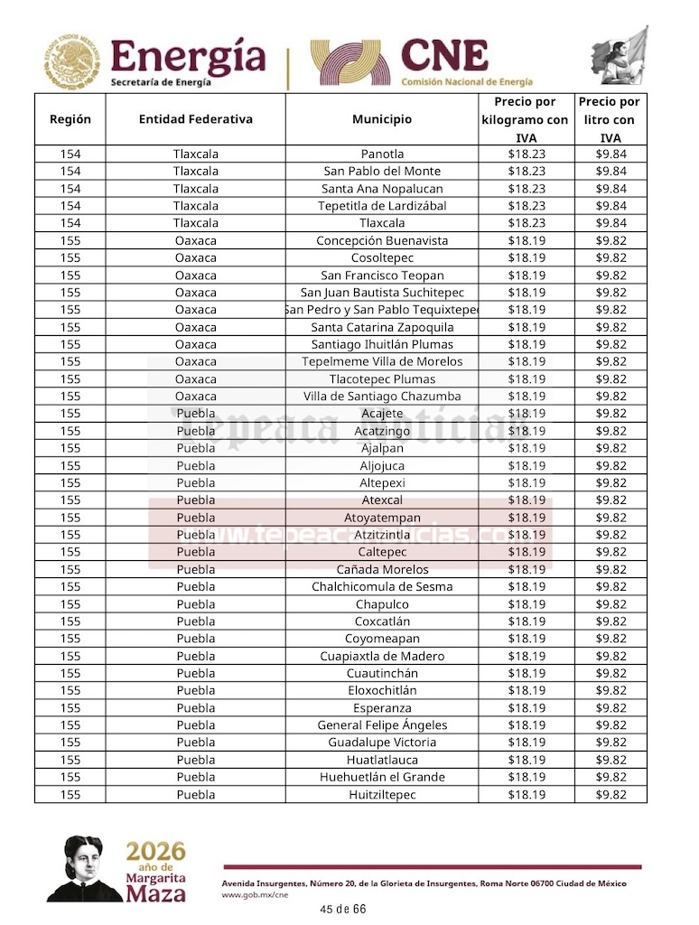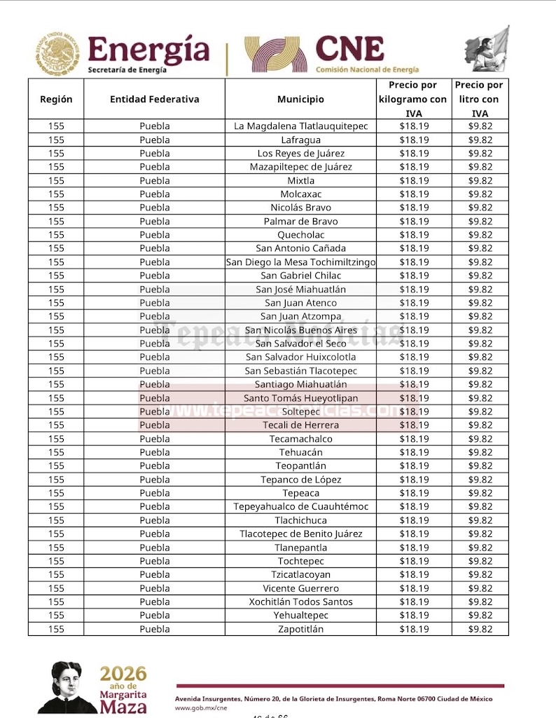 Tepeaca de Negrete.- El precio del gas LP al consumidor tendrá variación en el municipio de Tepeaca y la región, y desde este domingo 22 de febrero , mantiene un valor por kilogramo de 18.19 y 9.82 por litro , informó la Comisión Nacional de Energía de la Secretaría de Energía del Gobierno Federal y que estarán vigentes hasta el sábado 28 de febrero del 2026.