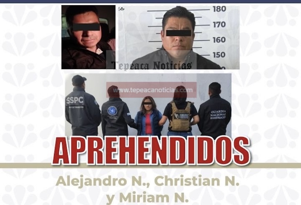 Las personas detenidas son Alejandro “N.”, Christian “N.” y Miriam “N.”, quienes presuntamente se encuentran relacionadas con la privación de la vida de un hombre y una mujer, cuyos cuerpos fueron localizados el 20 de febrero de 2026 en zona limítrofe entre los estados de Puebla y Tlaxcala.