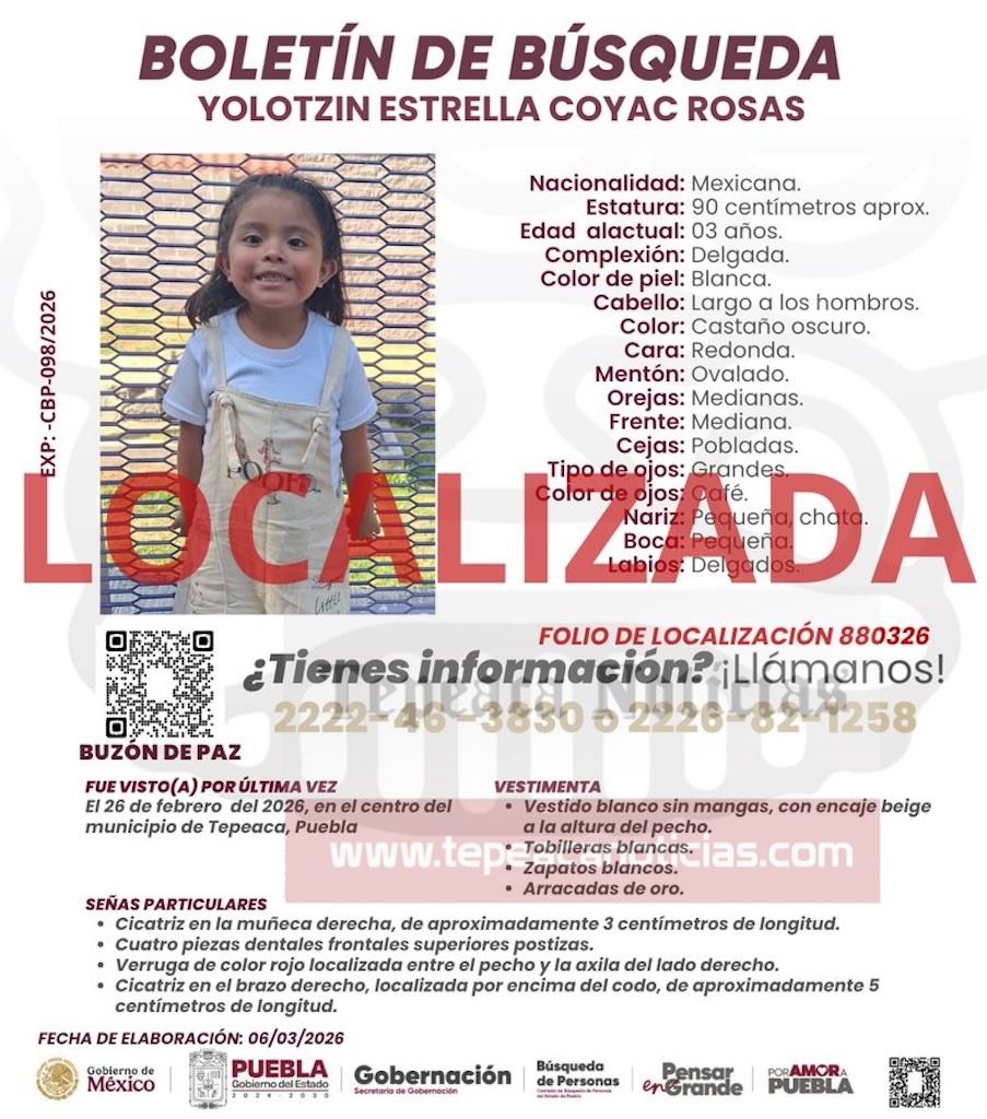 Tepeaca de Negrete.- La niña de tres años de edad, blanca de 90 centímetros de estatura , cabello castaño obscuro largo, cara redonda y ojos color café de nombre Yolotzin Estrella Coyac Rosas quién desapareció el pasado 26 de febrero en el Centro Histórico de Tepeaca , fue localizada con vida de a cuerdo a la Comisión de Búsqueda de Personas desaparecidas .