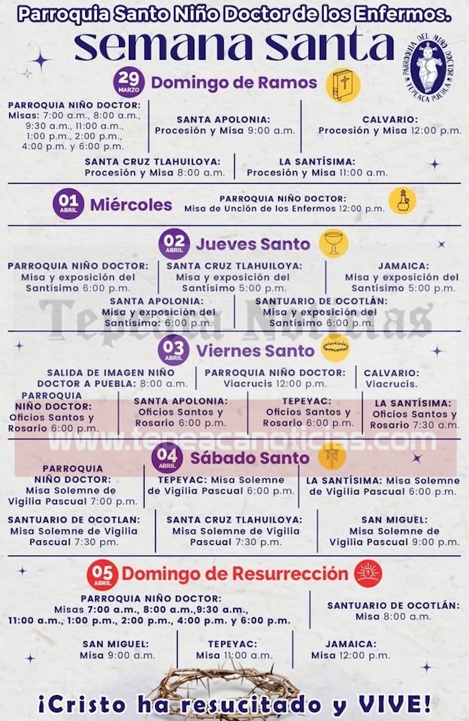 El 3 de abril, Viernes Santo a las 8 de la mañana saldrá la imagen del Niño Doctor rumbo a la capital poblana a la procesión de Viernes Santo y regresará a su templo alrededor de las 5:30 de la tarde . Media hora mas tarde serán los oficios santos y rosario a las 6 de la tarde .