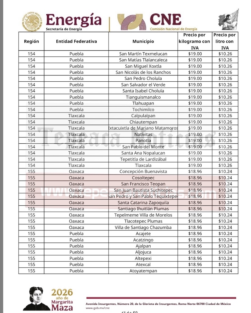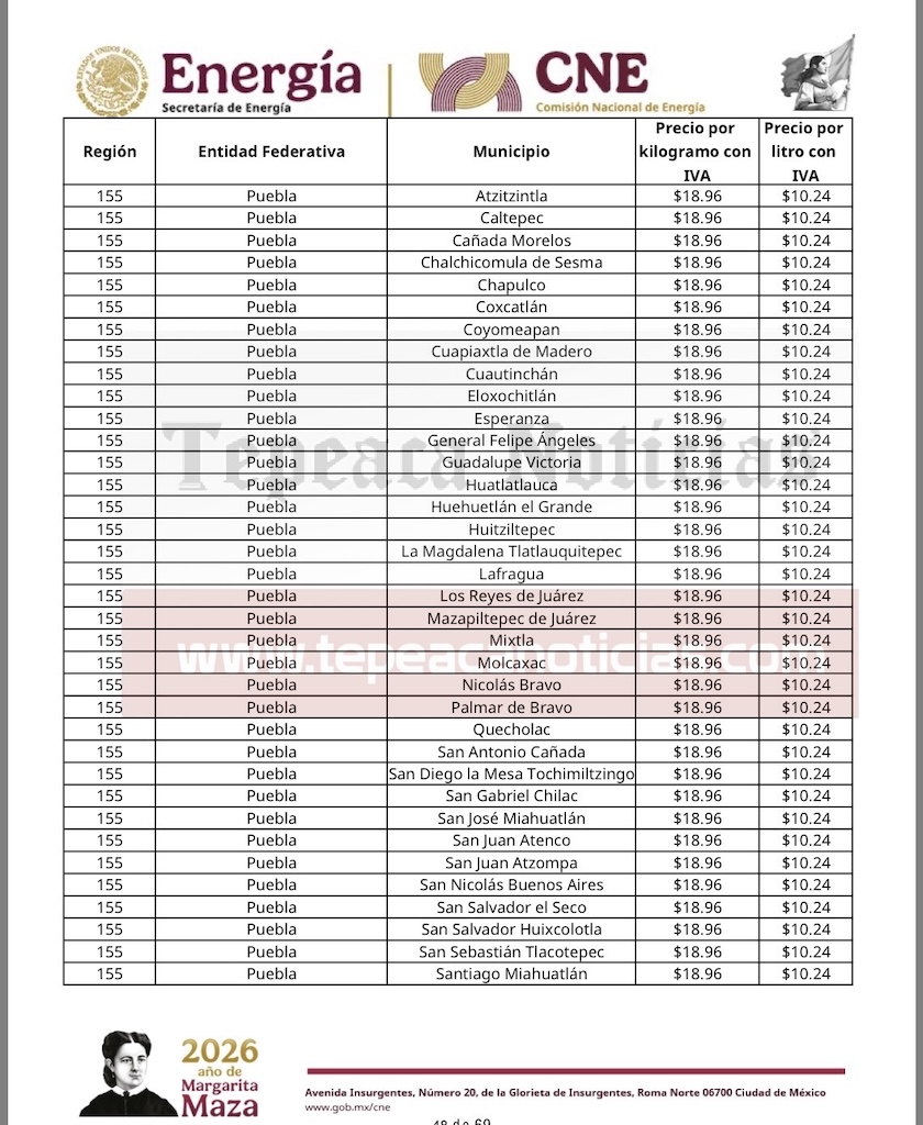 Tepeaca de Negrete.- El precio del gas LP al consumidor tendrá variación a la alza en el municipio de Tepeaca y la región, y desde el domingo 22 de marzo ,tendrá un valor por kilogramo de 18.96 y 10.24 por litro , informó la Comisión Nacional de Energía de la Secretaría de Energía del Gobierno Federal y que estarán vigentes hasta el sábado 28 de marzo del 2026.