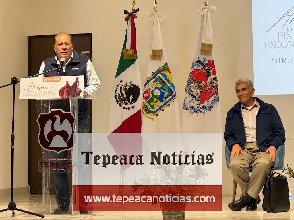 Tepeaca de Negrete.-La tarde noche del pasado jueves 26 de marzo, l maestro Ernesto Vega Álvarez , pintor, escultor y conferencista , acompañado por el alcalde Alfredo Velázquez Romero ,expuso platica de Arte Orgánico de la Pintura Exterior del Ex Convento Franciscano ante unos 200 asistentes reunidos en el salón Bicentenario en la presidencia municipal de Tepeaca.