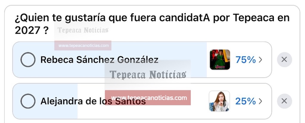 En el reciente sondeo de opinión realizado por Tepeaca Noticias a través de redes sociales, enfocado en posibles candidatas mujeres para un cargo de elección popular en Tepeaca de cara a las elecciones de 2027, una figura se posiciona de manera contundente dentro de las mujeres : Rebeca Sánchez González, quien acapara el 75 % de las preferencias. Este resultado no es casualidad ni un simple arrebato digital; refleja el reconocimiento ciudadano a una trayectoria construida desde el servicio directo a los más vulnerables, con entrega, cercanía y resultados tangibles.
