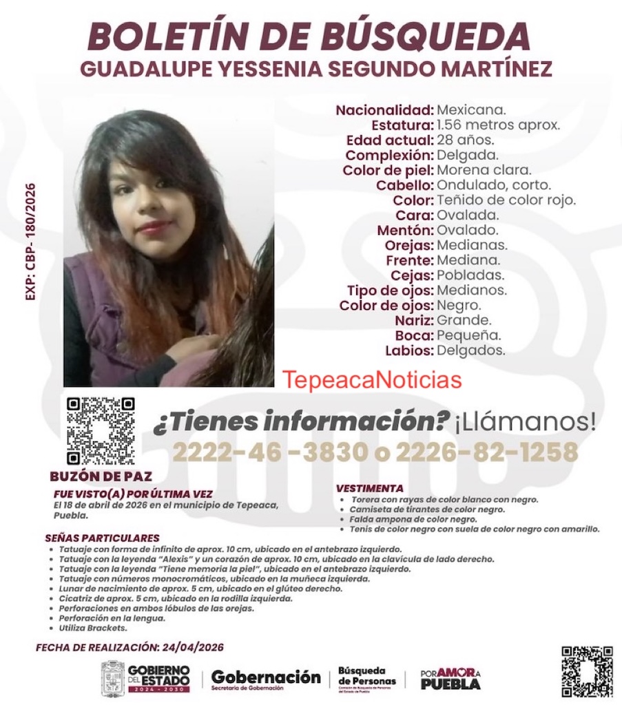 Cabe destacar que, recientemente , una mujer de 28 años de edad de nombre María Félix Centeno de la Cruz, de piel blanca , delgada , 1.56 metros de estatura y cabello ondulado teñido de color rojo ,también despareció desde el pasado 3 de diciembre del 2025 en el barrio de San Miguel en esta cabecera municipal de Tepeaca , sin que hasta la fecha se sepa de su paradero lugar en el que se encuentra.