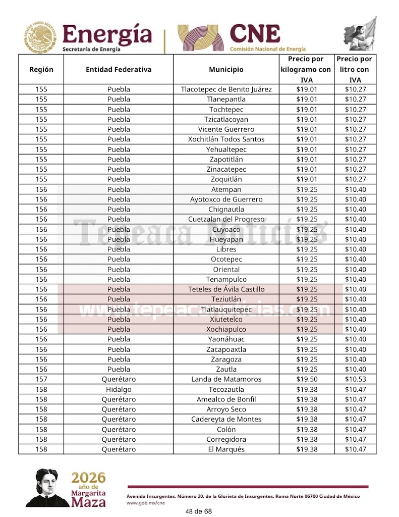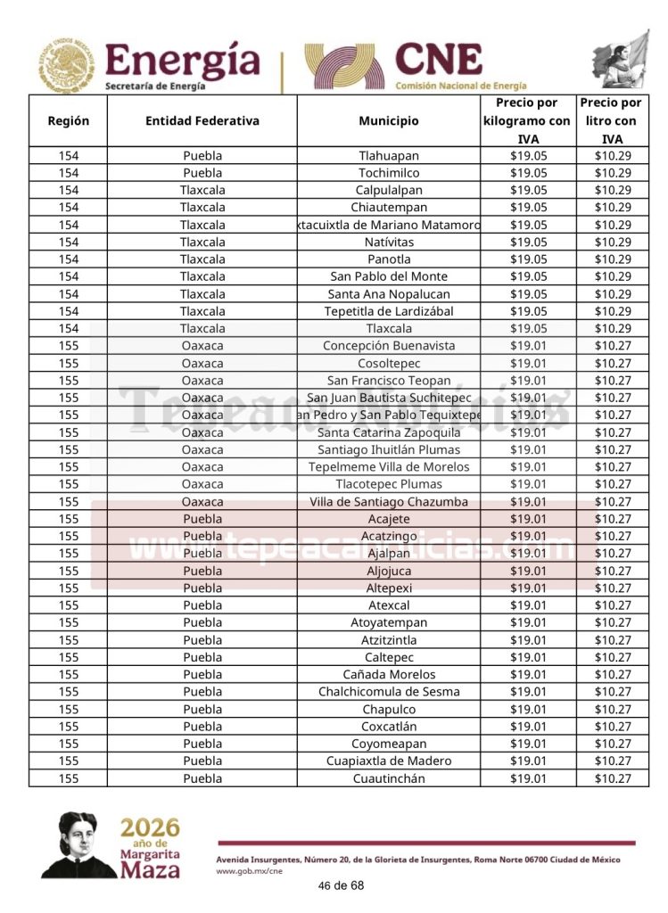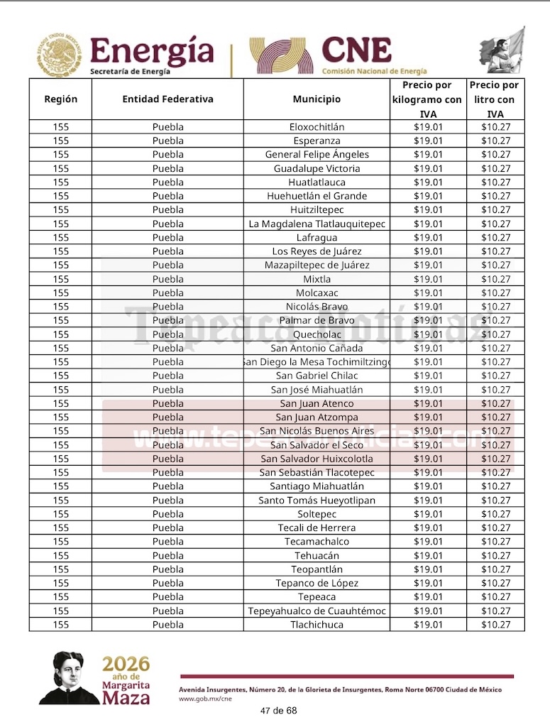 Tepeaca de Negrete.- El precio del gas LP al consumidor tendrá variación a la alza en el municipio de Tepeaca y la región, y desde el domingo 26 de abril ,tendrá un valor por kilogramo de 19.01 y 10.27 por litro , informó la Comisión Nacional de Energía de la Secretaría de Energía del Gobierno Federal y que estarán vigentes hasta el sábado 2 de mayo del 2026 en Puebla.